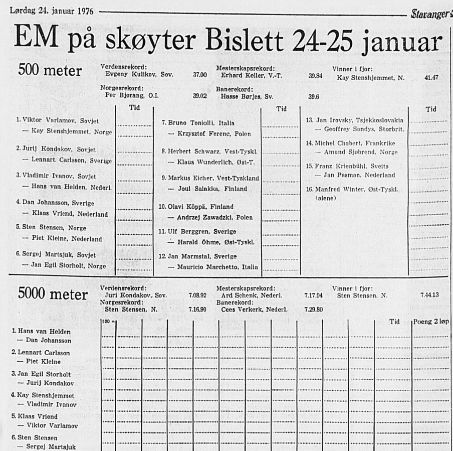 - At Stavanger Aftenblad, som familien naturligvis holdt, hadde en hel side med noteringsskjema for å fylle inn runde/passeringstider for de fire løpene, med parsammensetning for lørdagens to distanser. I tillegg hadde avisen trykket EM-deltakernes bestenoteringer og Ti på topp i år for hver distanse.