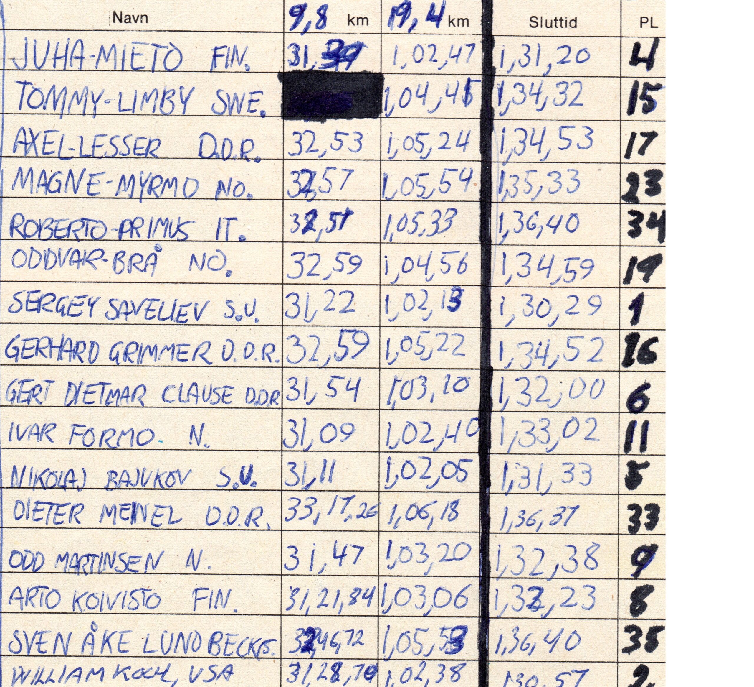 Skjermbilde fra TV-sendingen fra tremila i vinter-OL 1976 - passeringstider 9.8 km